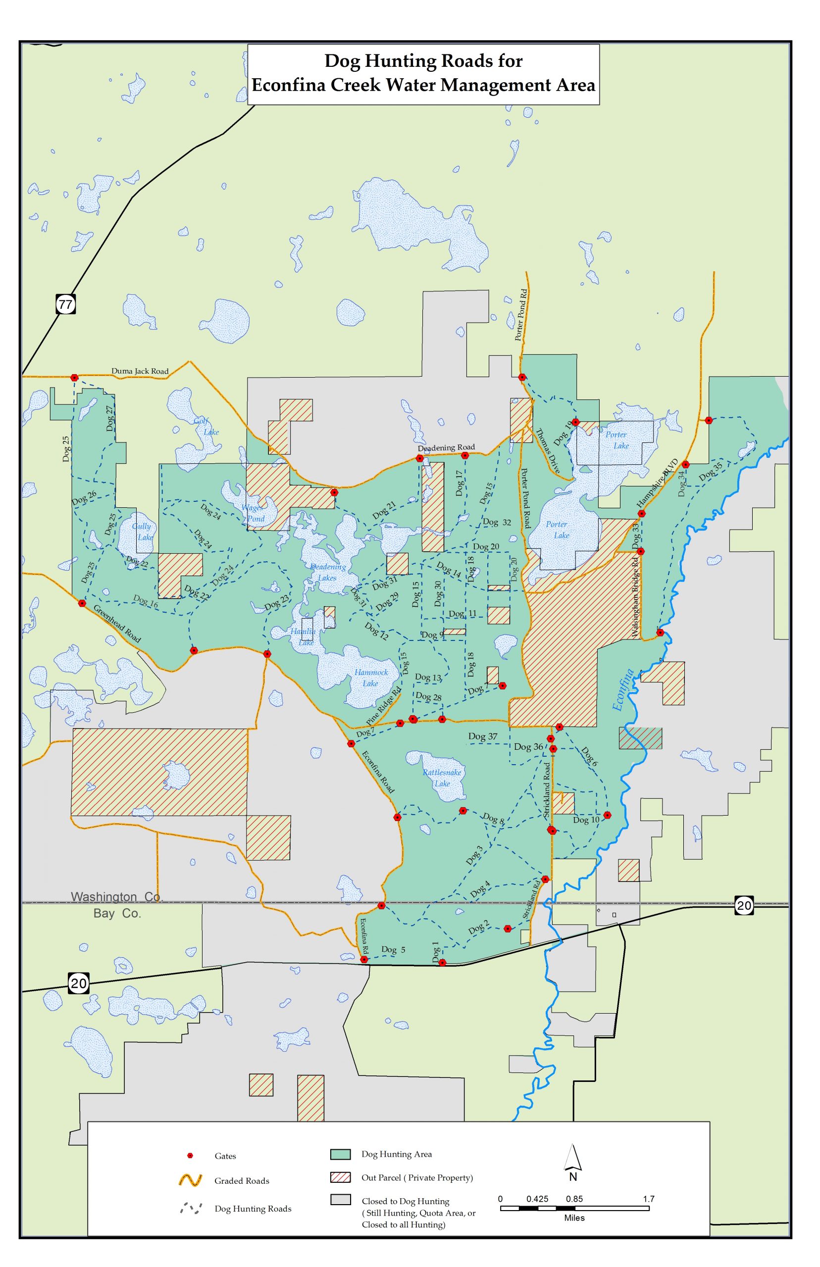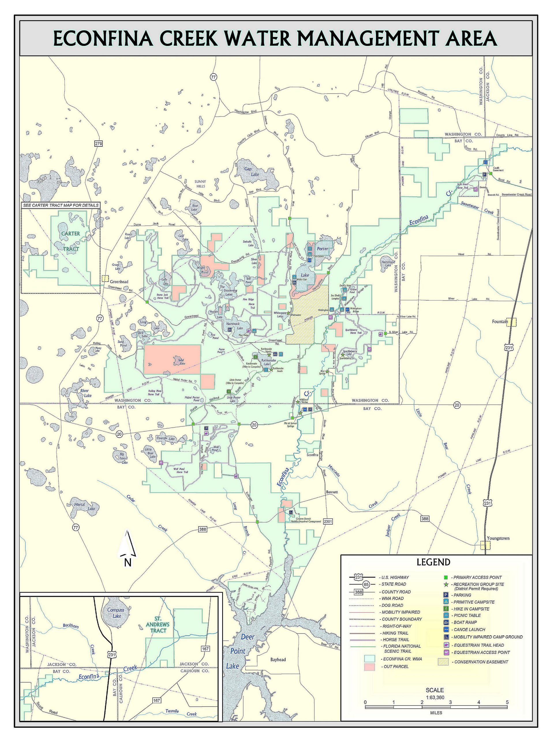 The Econfina Creek Water Management Area includes Fitzhugh Carter Tract, also known as the Sand Hill Lakes Mitigation Bank.